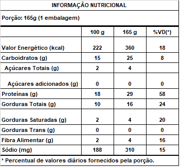 Ingredientes: carne bovina de patinho desfiada, carne seca desfiada, banana da terra, farinha de castanha de caju, farinha de grão de bico, farinha de arroz, queijo mussarela sem lactose, linhaça dourada, psyllium, azeite de oliva, sal marinho, cebola e alho.